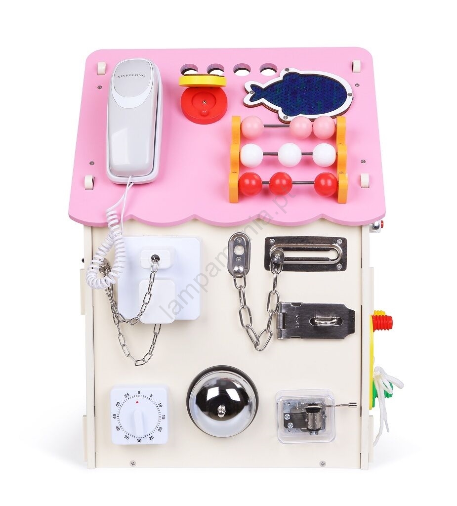 • Além das atividades que estimulam as habilidades sensoriais, o painel também conta com elementos educativos, como um contador e um relógio.
