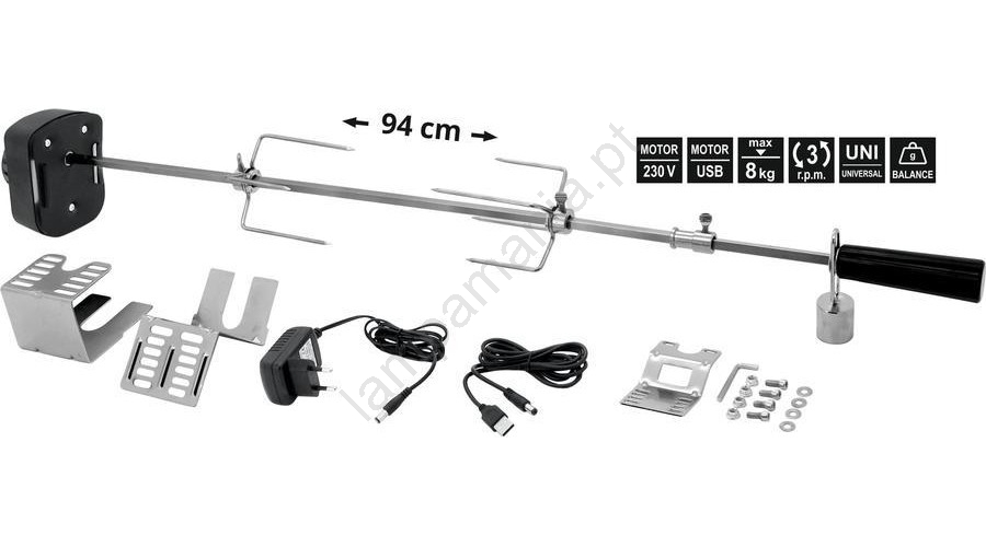 • O conjunto do motor e espeto em aço inoxidável tem comprimento total de 94 cm; sem o prolongador, a medida é de 84 cm.