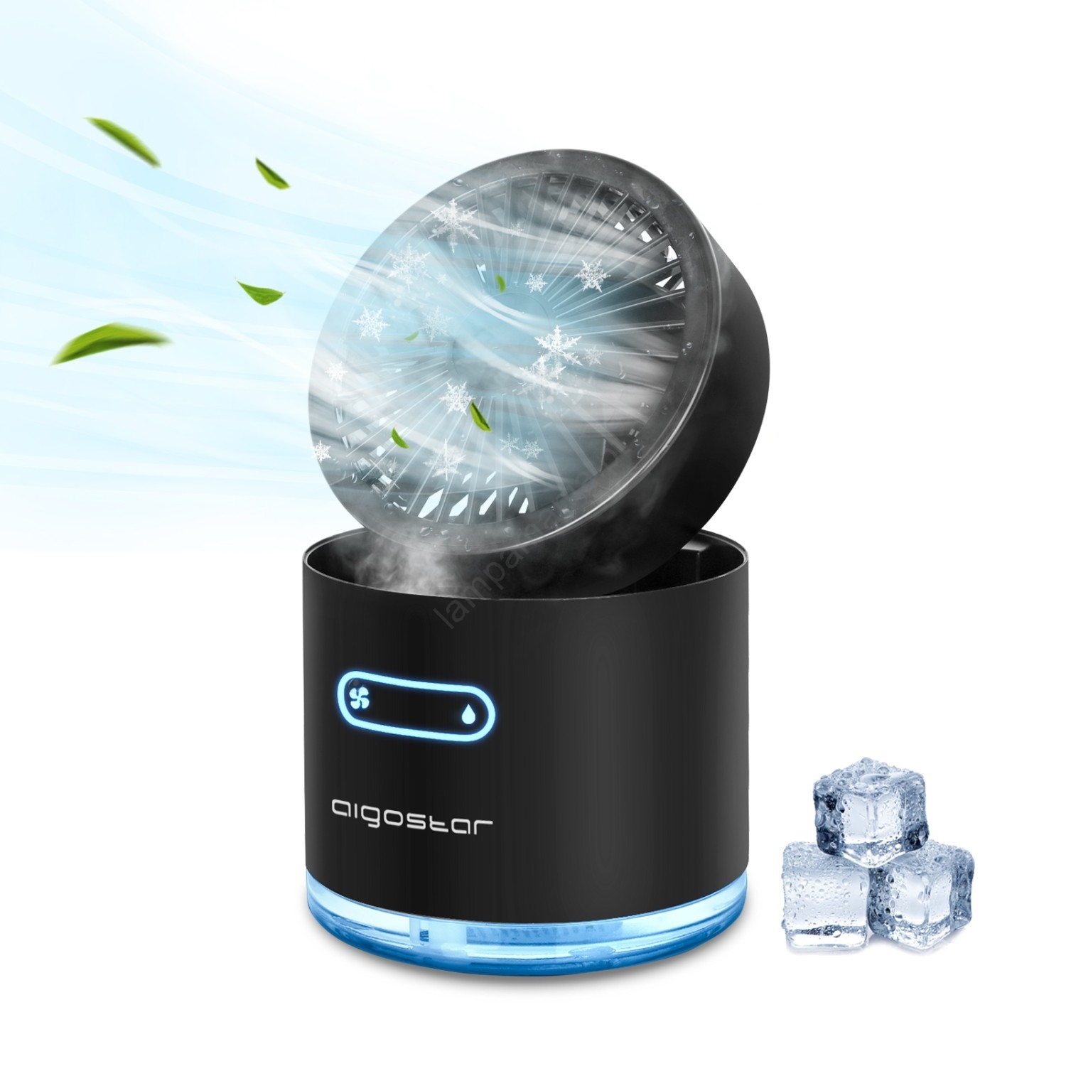 • Ventilador de mesa portátil com umidificador e iluminação LED.