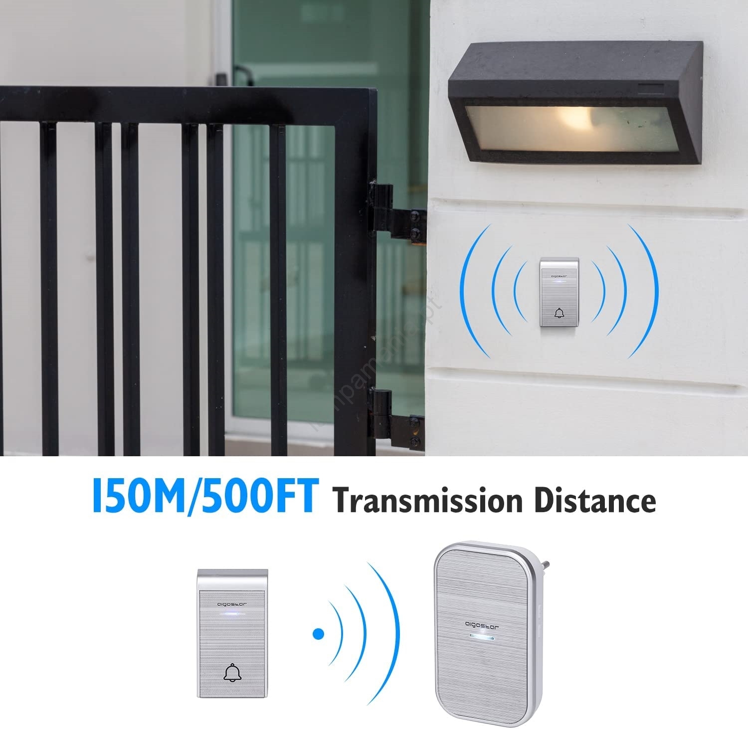 • Campainha sem fio com alcance de sinal de 150 m.