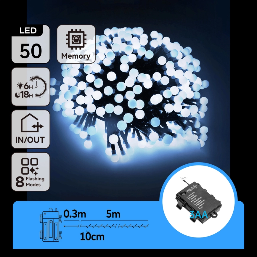 Aigostar - Guirlanda de Natal LED para exterior 50xLED/8 funções 3xAA 5,3m IP44 branco frio