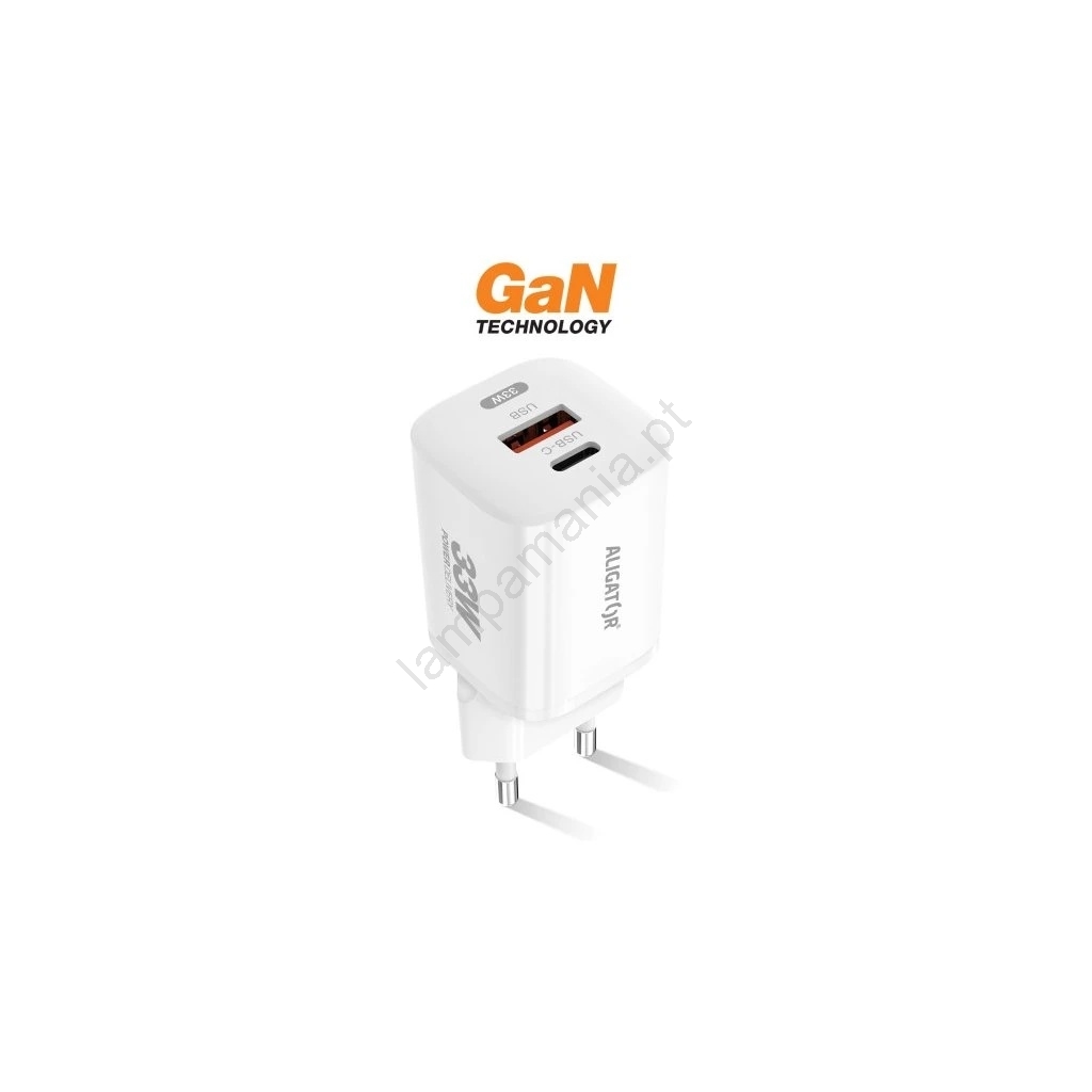 Aligator CHPD0020 - Adaptador de carregamento rápido GaN com Power Delivery de 33W USB-A + USB-C branco