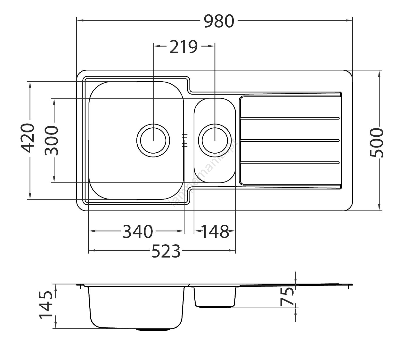 • Pia com uma cuba grande e uma cuba menor.