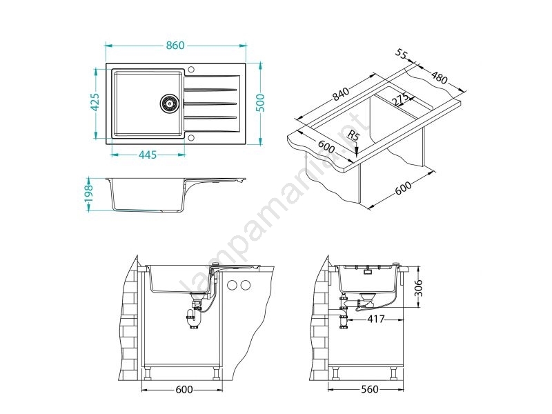 • Conteúdo da embalagem: pia de granito, fixadores para instalação superior, válvula de cesta 3 1/2, sifão com derivação para lava-louças, controle excêntrico do ralo.