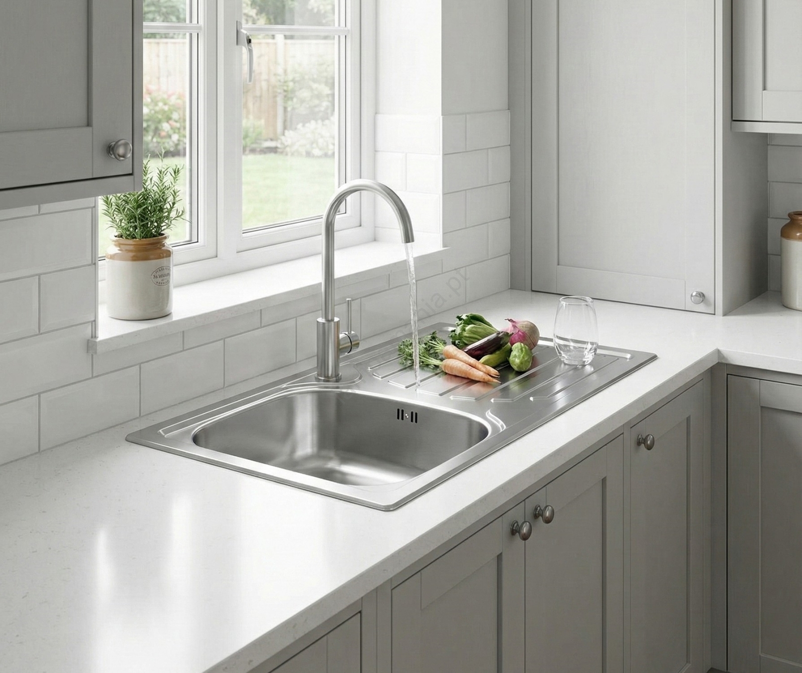 • Cuba de cozinha em aço inoxidável com design clássico, incluindo uma torneira prática para cuba.