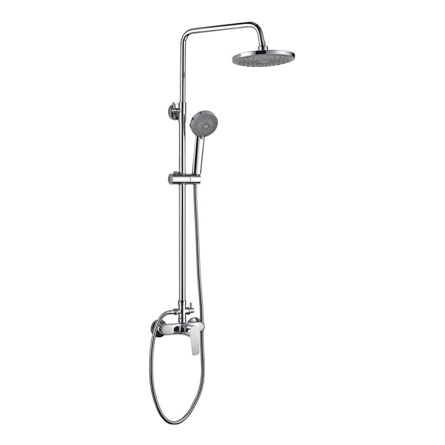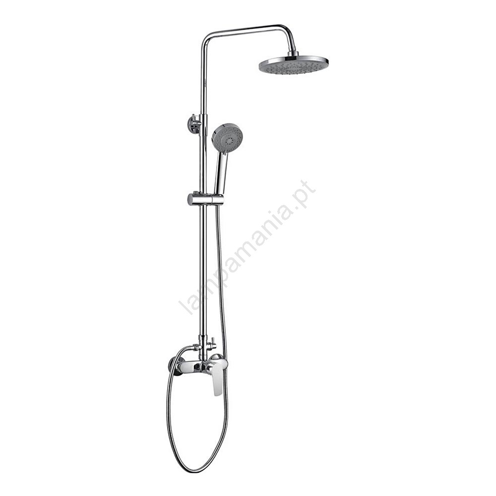 • O conjunto inclui torneira de alavanca, chuveiro de teto e manual, barra de chuveiro e mangueira.