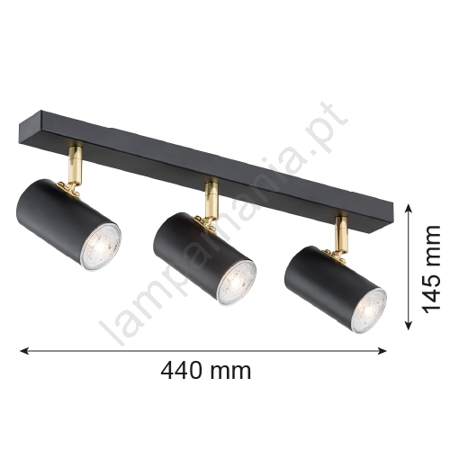 Argon 1476 - Foco LAGOS 3xGU10/5W/230V preto/latão caracteriza-se por um design agradável e funcional.  Uma lâmpada com casquilho GU10 é adequada para a iluminação Aqui, pode comprar outras lâmpadas a preços vantajosos. Terá um complemento interessante para a sua casa.