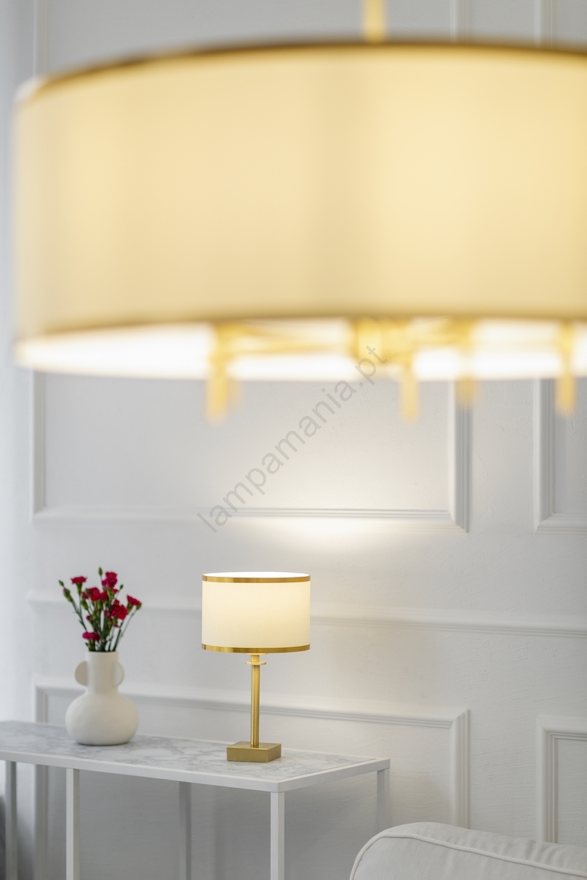 Argon 8047 - Candeeiro de mesa ABBANO 1xE27/15W/230V latão/branco caracteriza-se por um design agradável e funcional.  Uma lâmpada com casquilho E27 é adequada para a iluminação Aqui, pode comprar outras lâmpadas a preços vantajosos. Terá um complemento interessante para a sua casa.