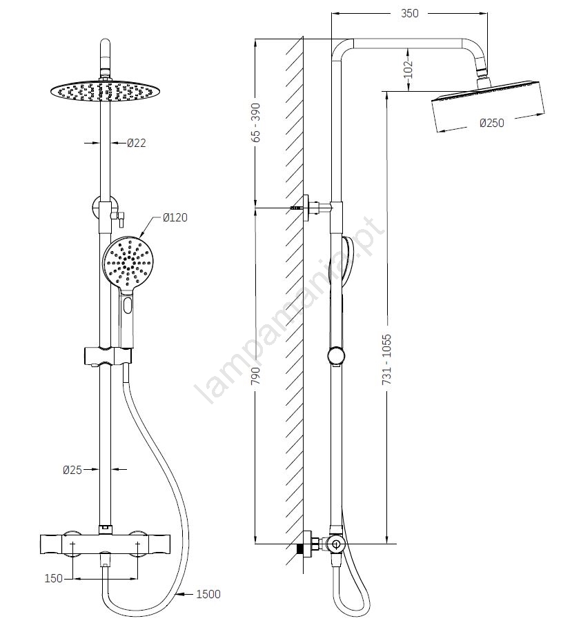• Barras de chuveiro e chuveiro superior em aço inoxidável com acabamento PVD.