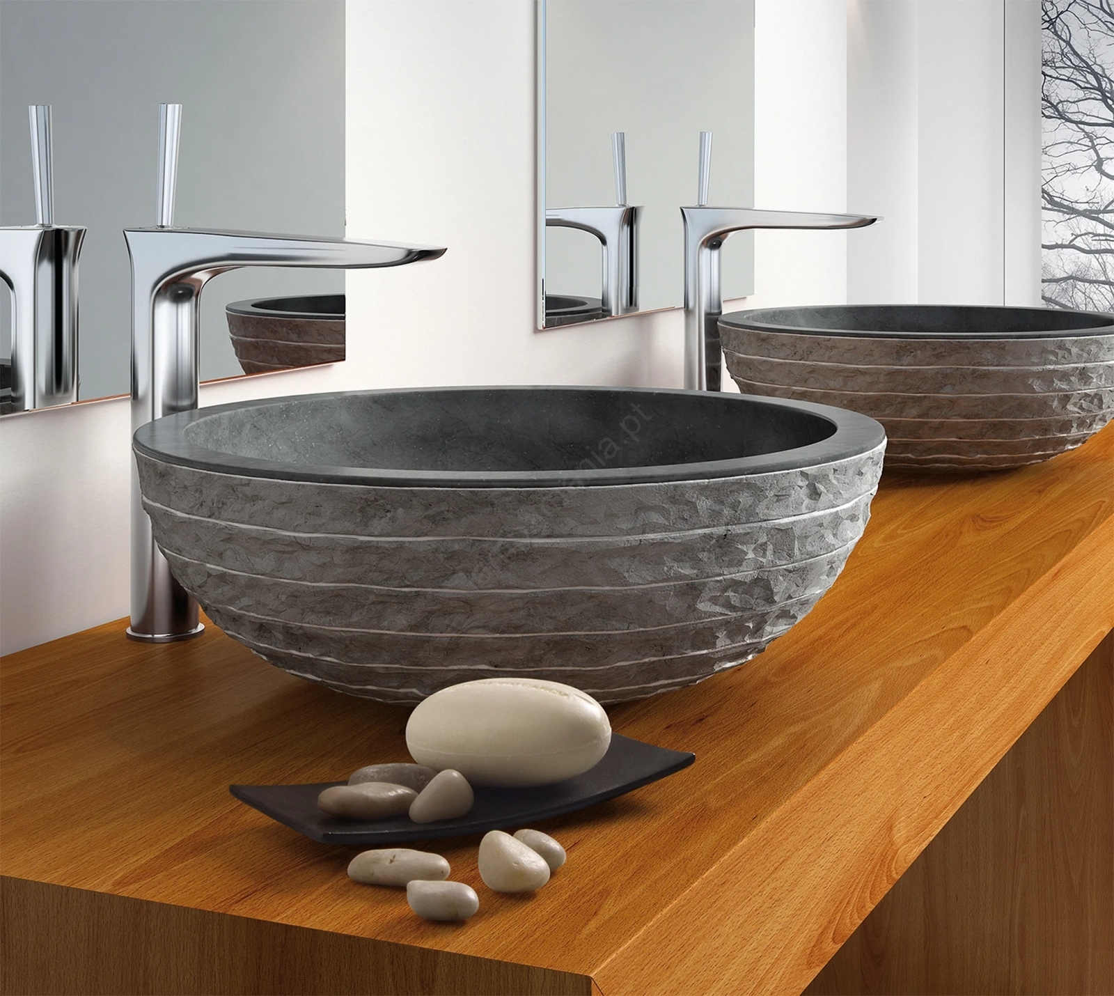 • O lavabo é fabricado em pedra natural.