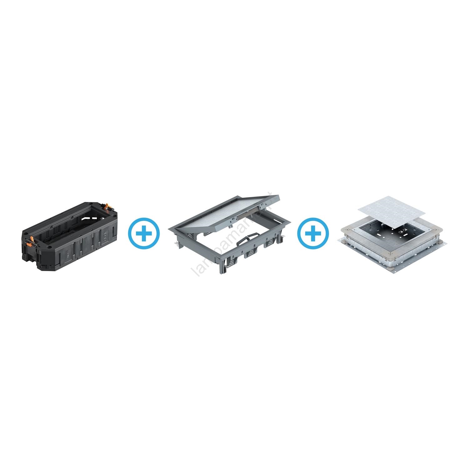 • Caixa com caixa de dispositivos para canais de instalação de piso preenchidos com argamassa, com laterais de chapa de aço.