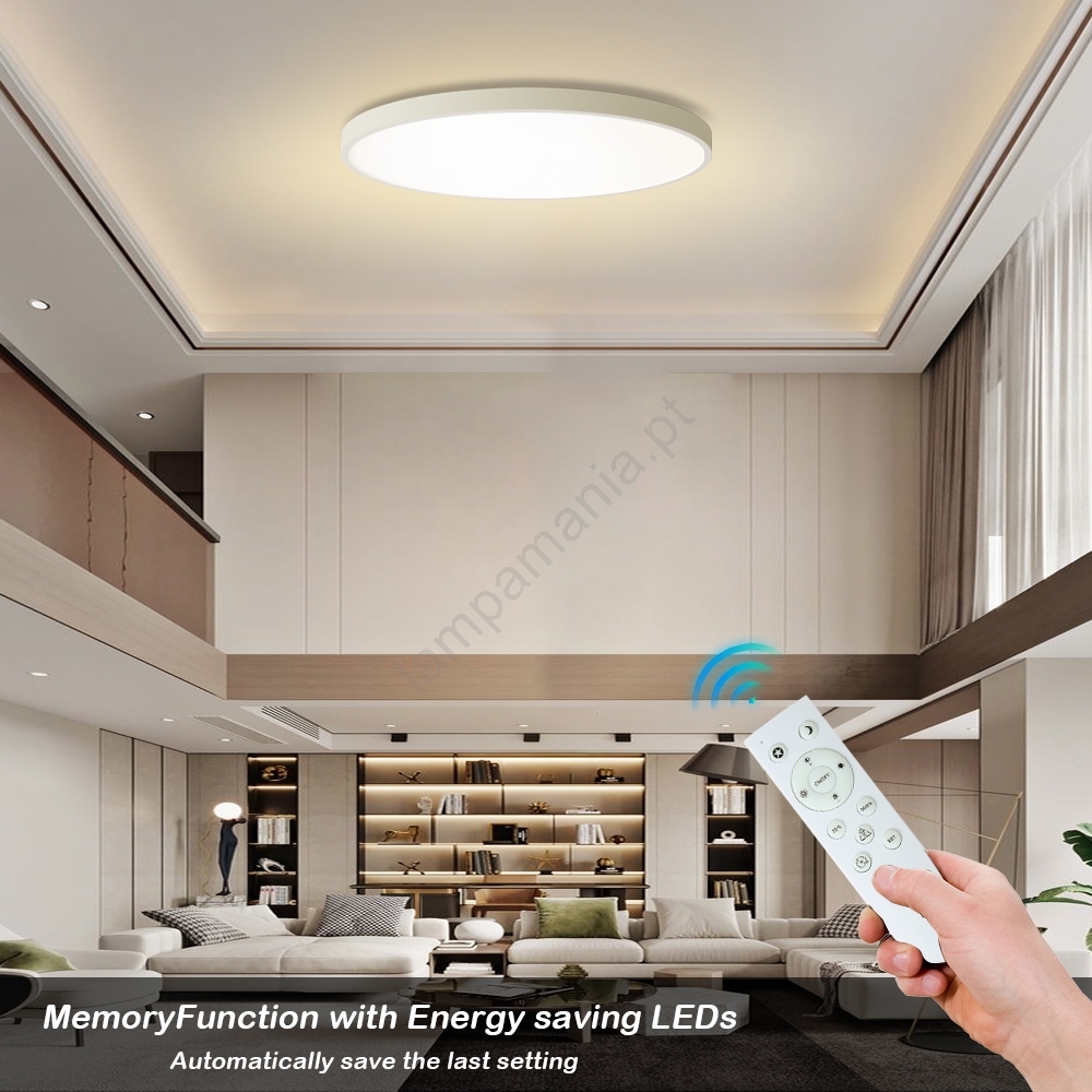 • Luminária de teto LED que pode ser confortavelmente controlada por comando remoto ou através de telemóvel.