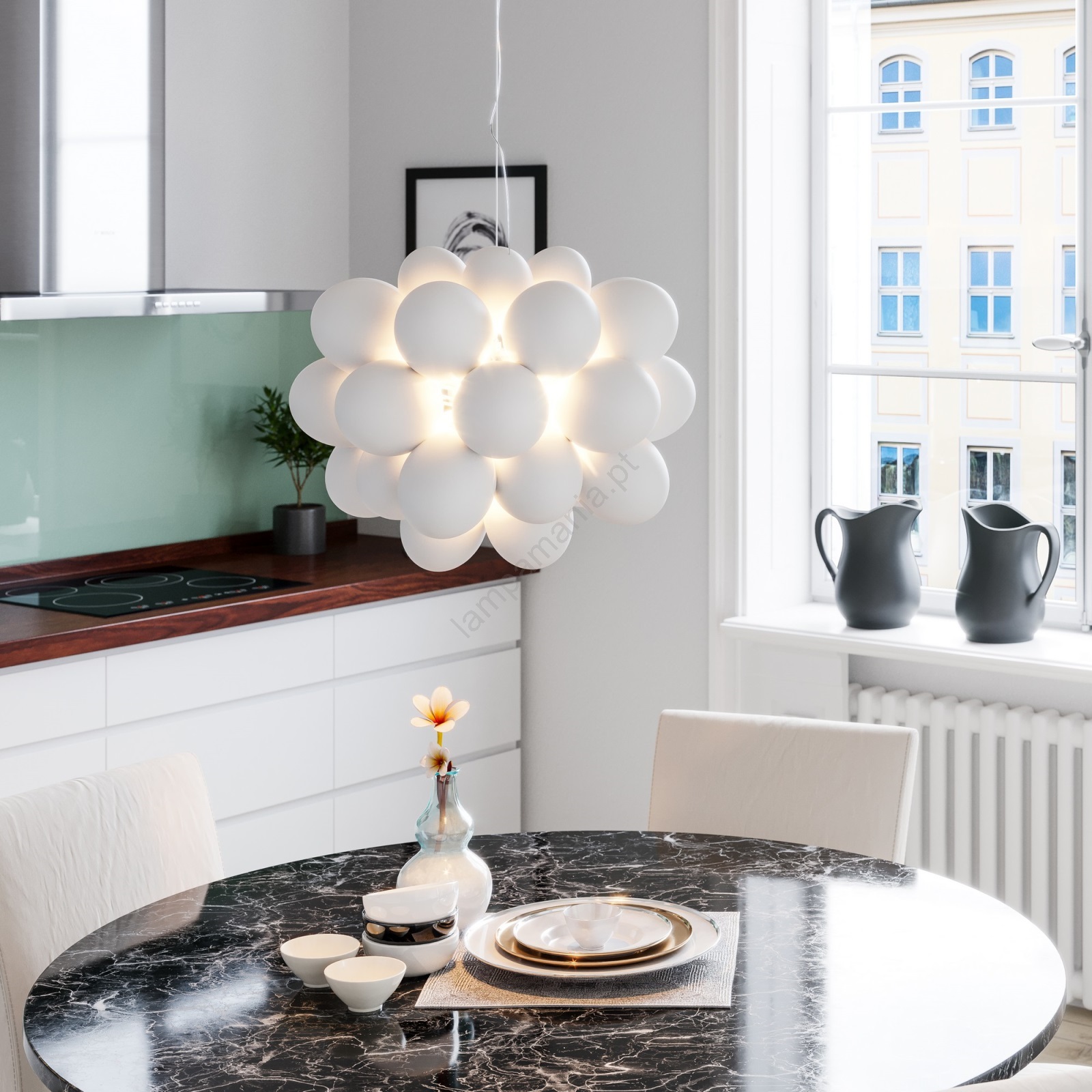 ByRydens - Candeeiro suspenso GROSS 8xG9/4W/230V branco diâmetro 50 cm caracteriza-se por um design agradável e funcional.  Uma lâmpada com casquilho G9 é adequada para a iluminação Aqui, pode comprar outras lâmpadas a preços vantajosos. Terá um complemento interessante para a sua casa.