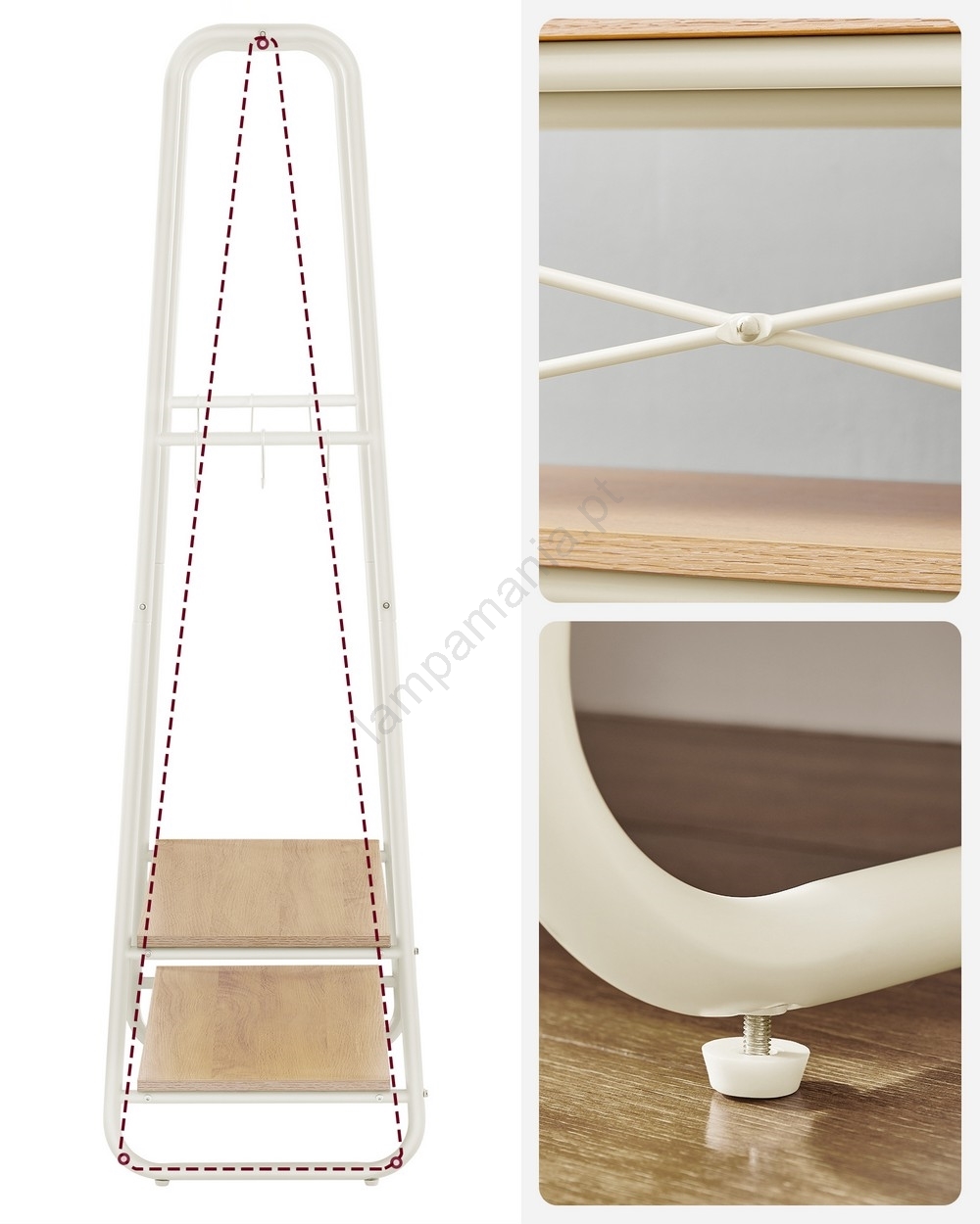 • Pendure casacos, camisas e calças na haste superior ao longo de todo o comprimento; coloque bolsas, sapatos ou caixas nas 2 prateleiras de arrumação; chapéus, cachecóis e guarda-chuvas podem ser pendurados nas laterais.