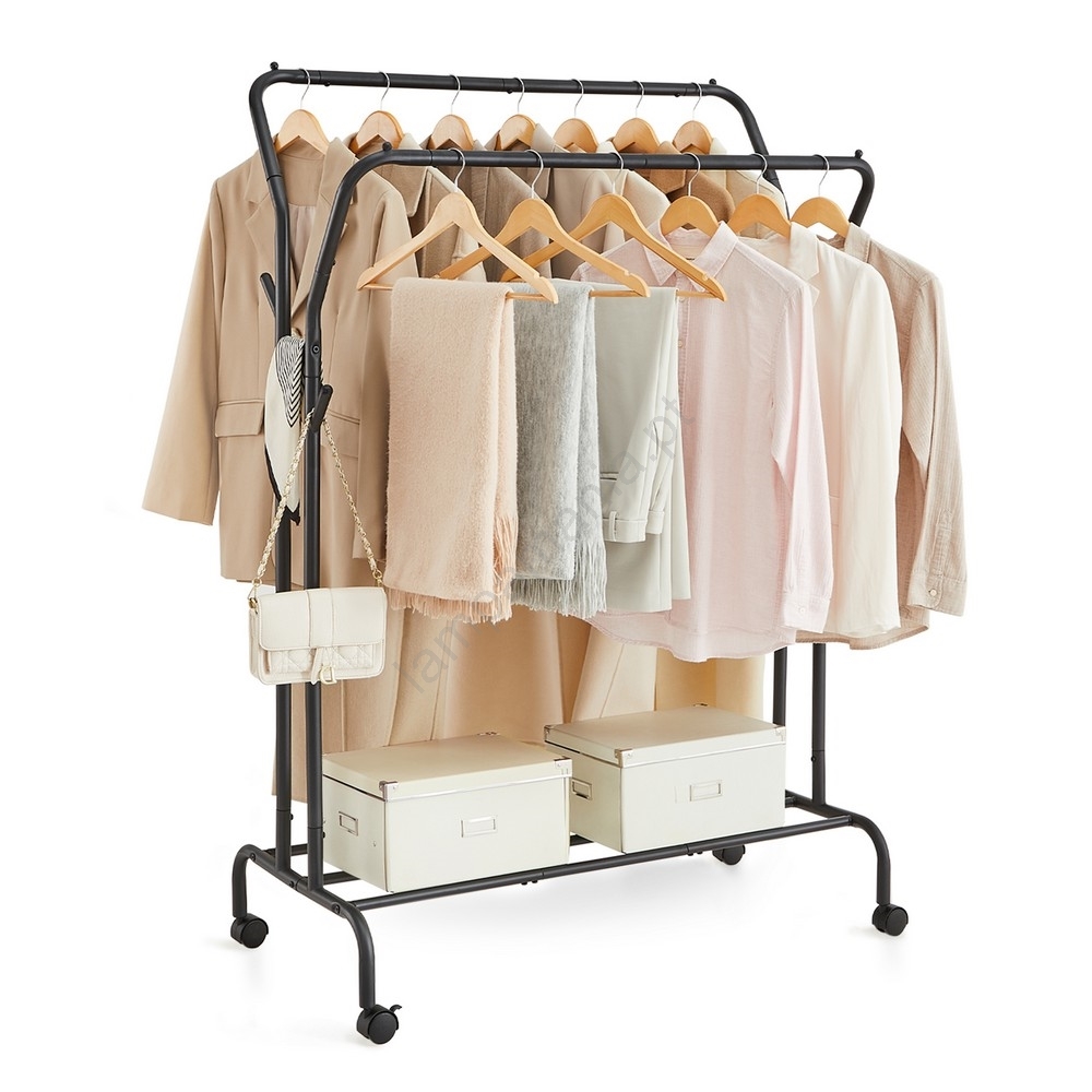 • Com varões para pendurar roupa de diferentes comprimentos, ganchos em ambos os lados e uma prateleira inferior, este cabide mantém todos os seus itens essenciais organizados num só lugar.