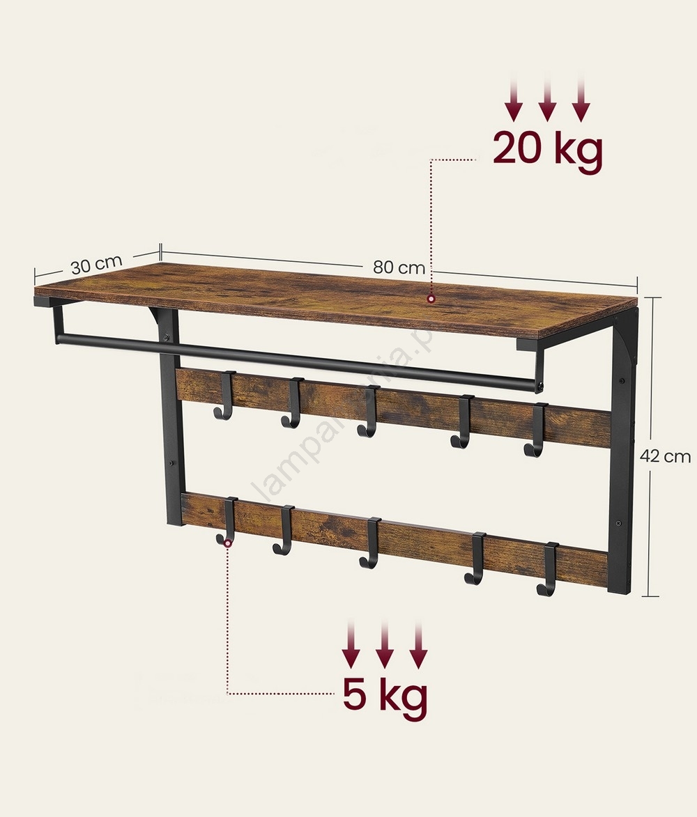• Tem capacidade máxima de 20 kg para a prateleira, 5 kg para cada gancho e 15 kg para a barra (capacidade máxima total do cabideiro: 45 kg).
