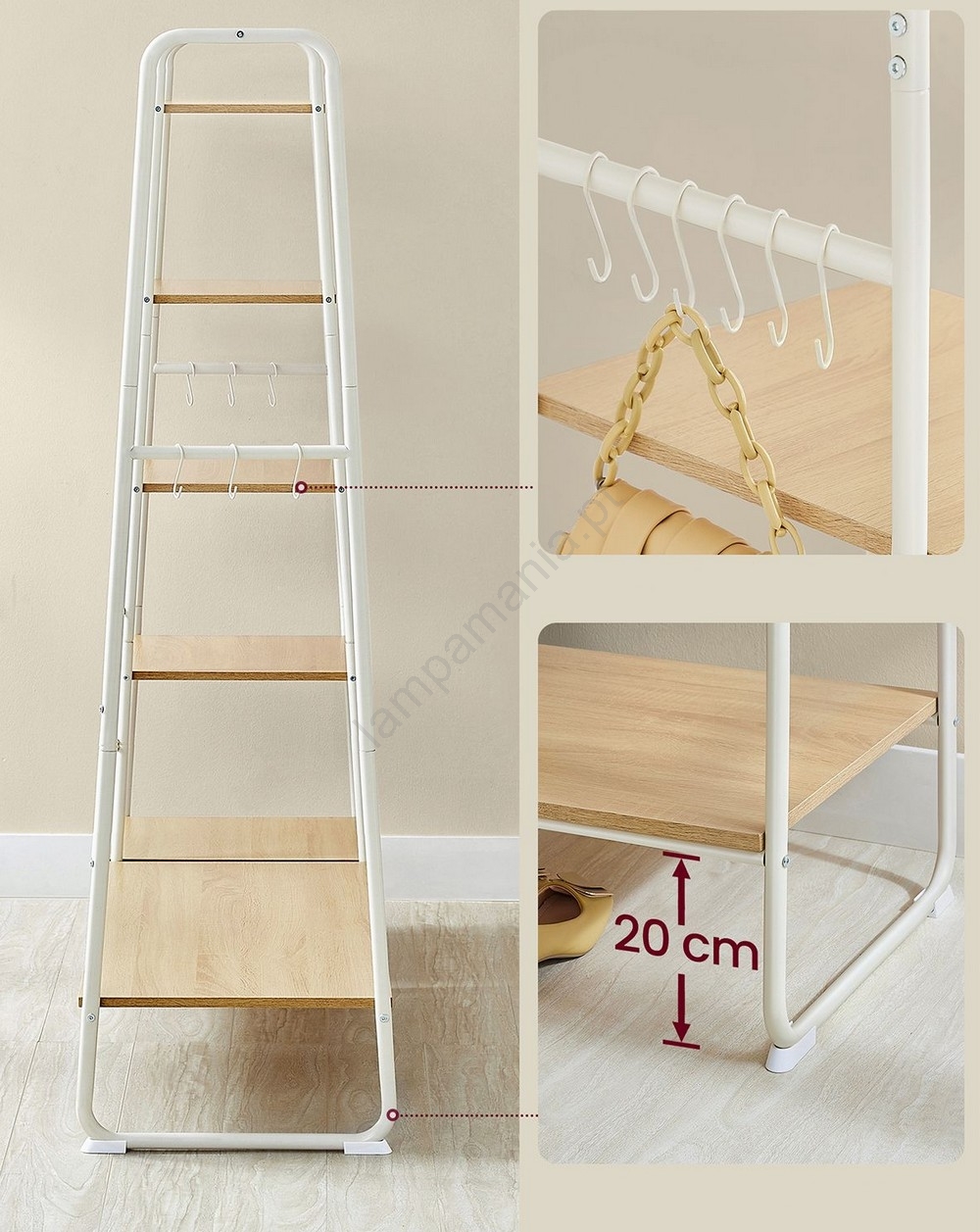 • O conjunto inclui ainda 6 ganchos laterais em forma de S, que pode pendurar nas laterais do cabideiro para que as suas roupas, sapatos, malas, decorações e plantas fiquem perfeitamente arrumados.