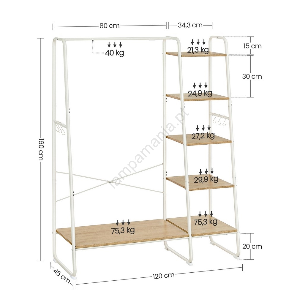 • O cabideiro suporta até 220 kg (com distribuição uniforme da carga) sem oscilar ou tombar, a barra para pendurar suporta até 40 kg.