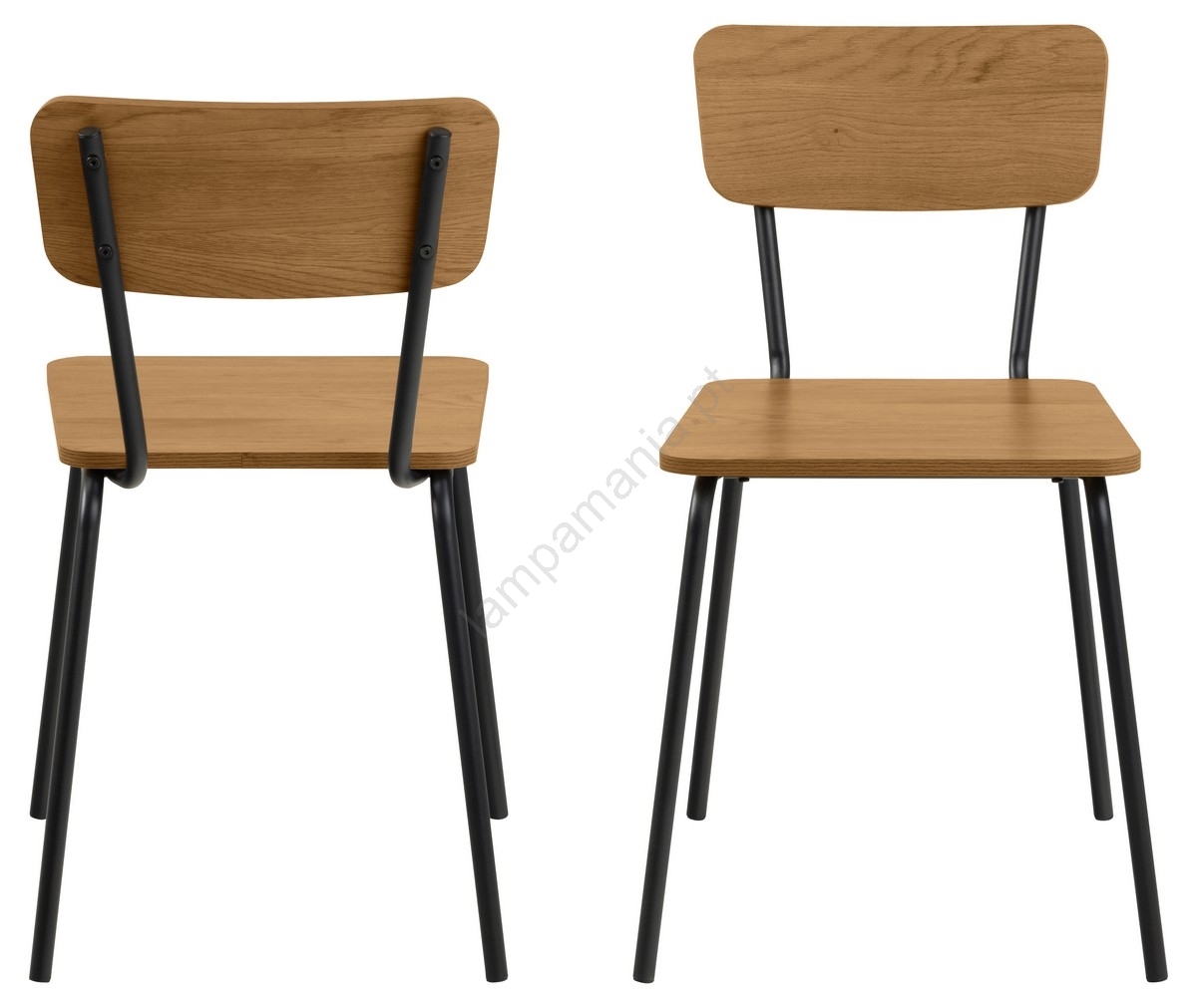 • O assento retangular e o encosto com aparência de carvalho são conectados por uma estrutura tubular de aço preto.
