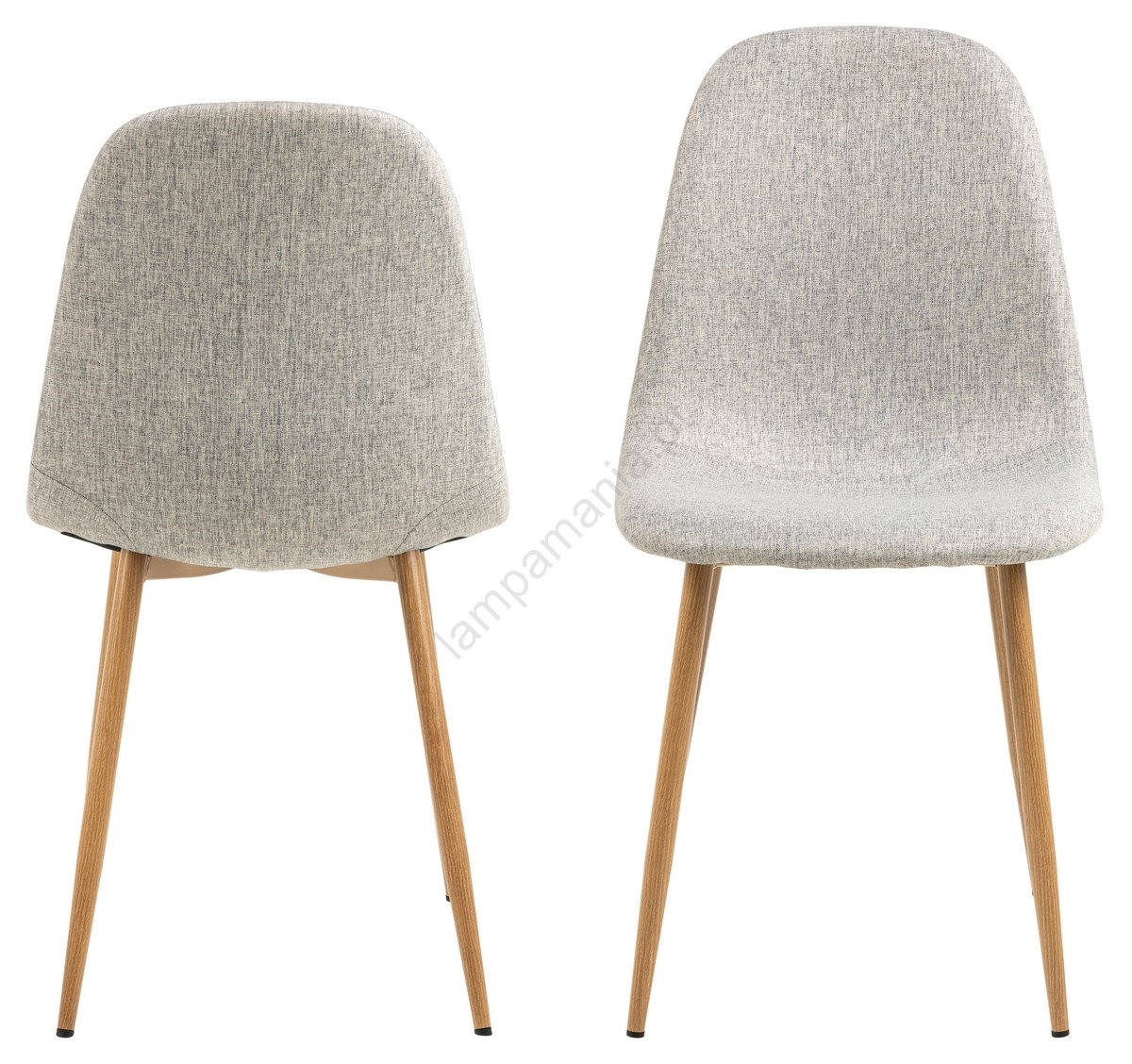 • O assento cinza claro, adornado com costura horizontal, é sustentado por pernas esguias com decoração de carvalho, que conferem ao design uma estética minimalista marcante.