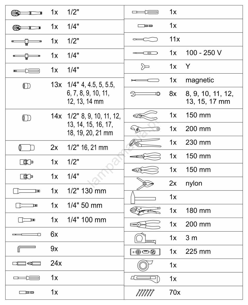 • O conjunto inclui alicates, chaves de fendas, chaves de fendas, martelo, nível de bolha, chaves laterais e Allen, bits, fixadores básicos, e uma variedade de outras ferramentas.