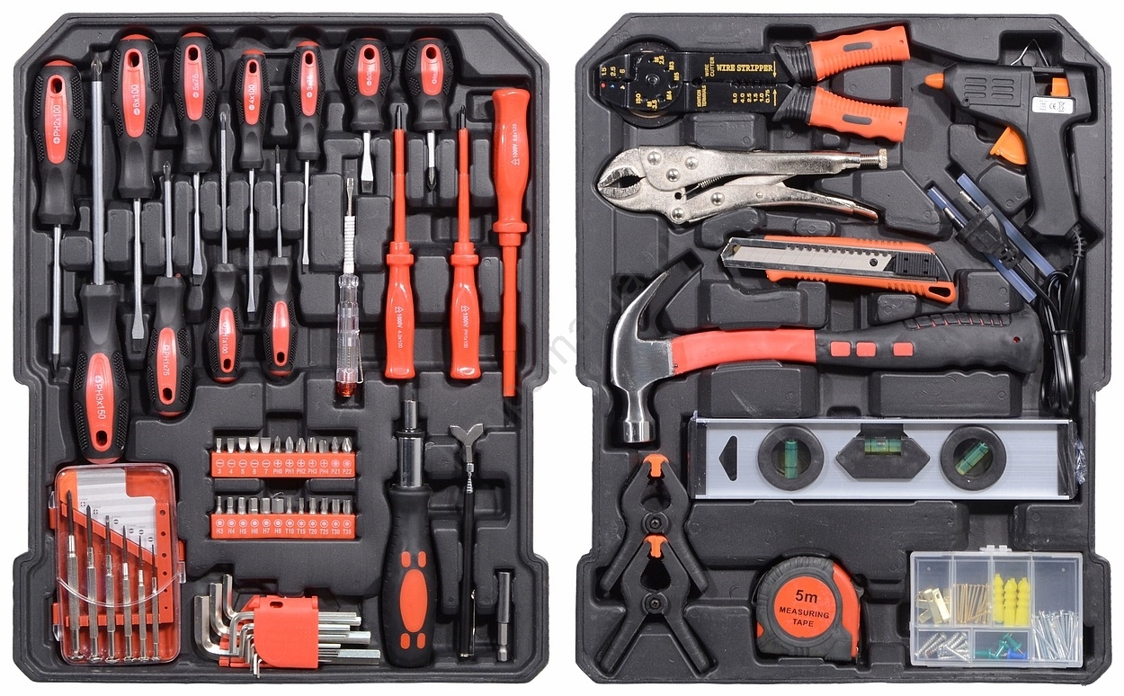 • O conjunto inclui alicate, chaves de fendas, chave de fendas gola, martelo, nível de bolha, chaves laterais e Allen, bits, fixadores básicos, e uma variedade de outras ferramentas.