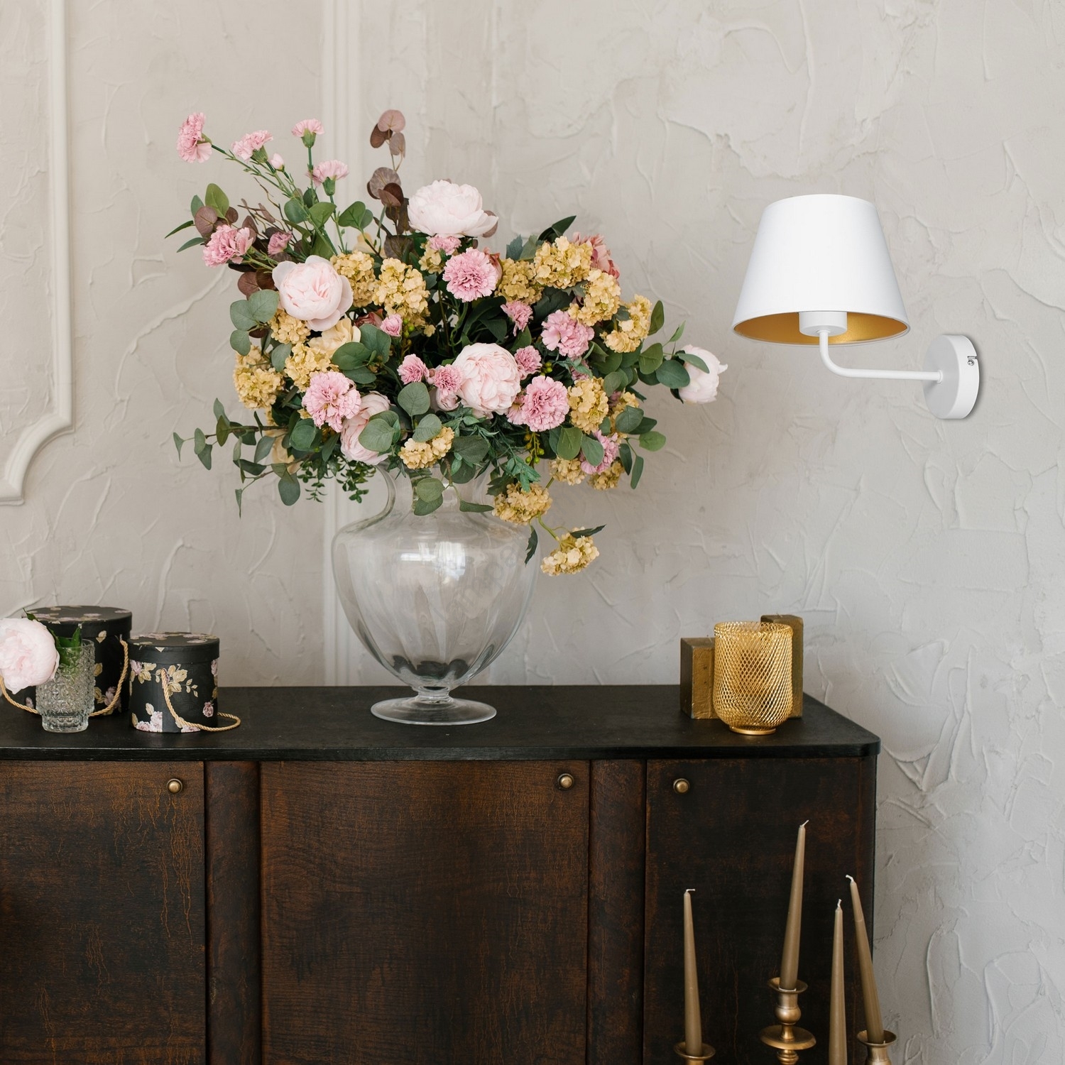 Luminária de parede ARDEN 1xE27/60W/230V branca/dourada caracteriza-se por um design agradável e funcional.  Uma lâmpada com casquilho E27 é adequada para a iluminação Aqui, pode comprar outras lâmpadas a preços vantajosos. Terá um complemento interessante para a sua casa.