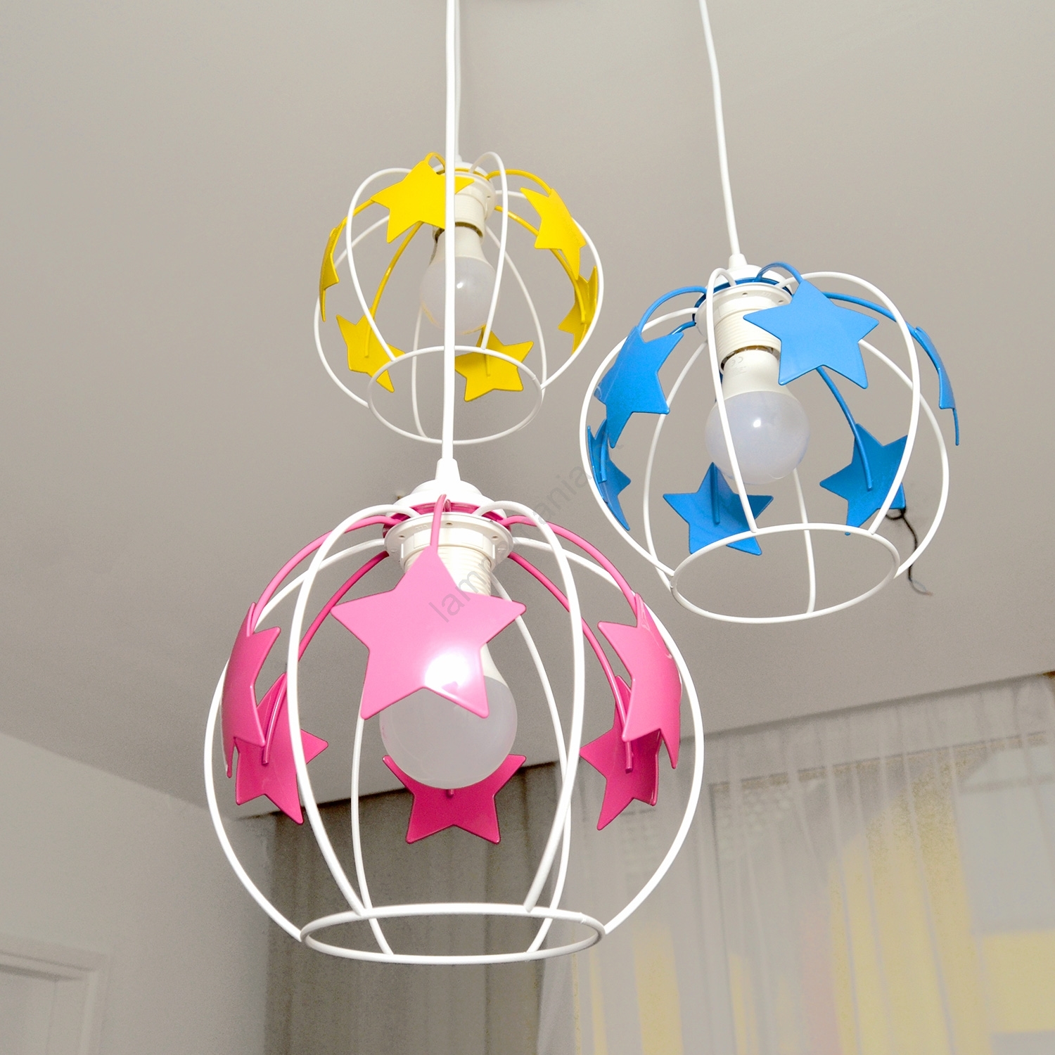 Candeeiro suspenso de criança STARS 3xE27/15W/230V azul/rosa/amarelo caracteriza-se por um design agradável e funcional.  Uma lâmpada com casquilho E27 é adequada para a iluminação Aqui, pode comprar outras lâmpadas a preços vantajosos. Terá um complemento interessante para a sua casa.