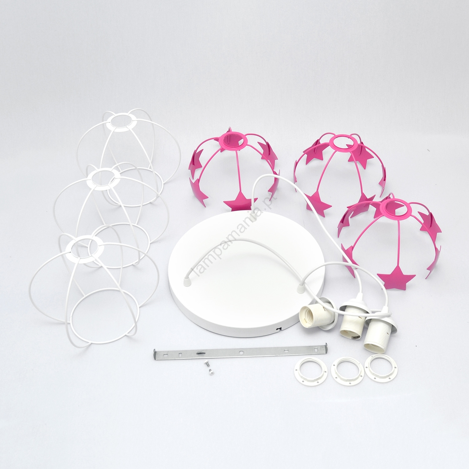 Candeeiro suspenso de criança STARS 3xE27/15W/230V rosa/branco caracteriza-se por um design agradável e funcional.  Uma lâmpada com casquilho E27 é adequada para a iluminação Aqui, pode comprar outras lâmpadas a preços vantajosos. Terá um complemento interessante para a sua casa.