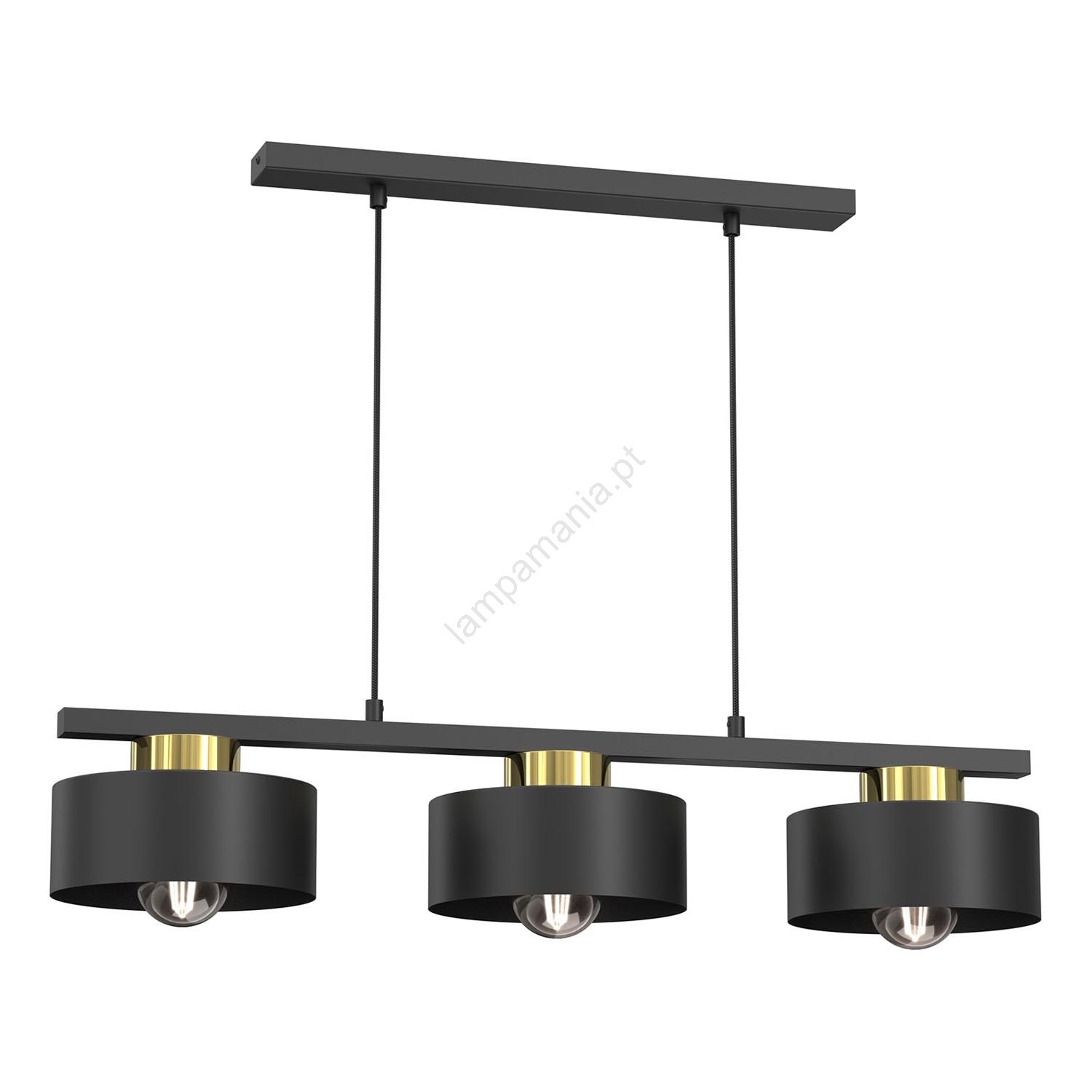 Candeeiro suspenso MARTI 3xE27/15W/230V preto/dourado caracteriza-se por um design agradável e funcional.  Uma lâmpada com casquilho E27 é adequada para a iluminação Aqui, pode comprar outras lâmpadas a preços vantajosos. Terá um complemento interessante para a sua casa.