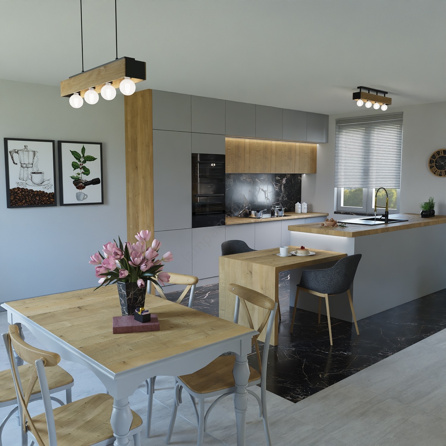 Candeeiro suspenso MILUZA 4xE27/15W/230V caracteriza-se por um design agradável e funcional.  Uma lâmpada com casquilho E27 é adequada para a iluminação Aqui, pode comprar outras lâmpadas a preços vantajosos. Terá um complemento interessante para a sua casa.