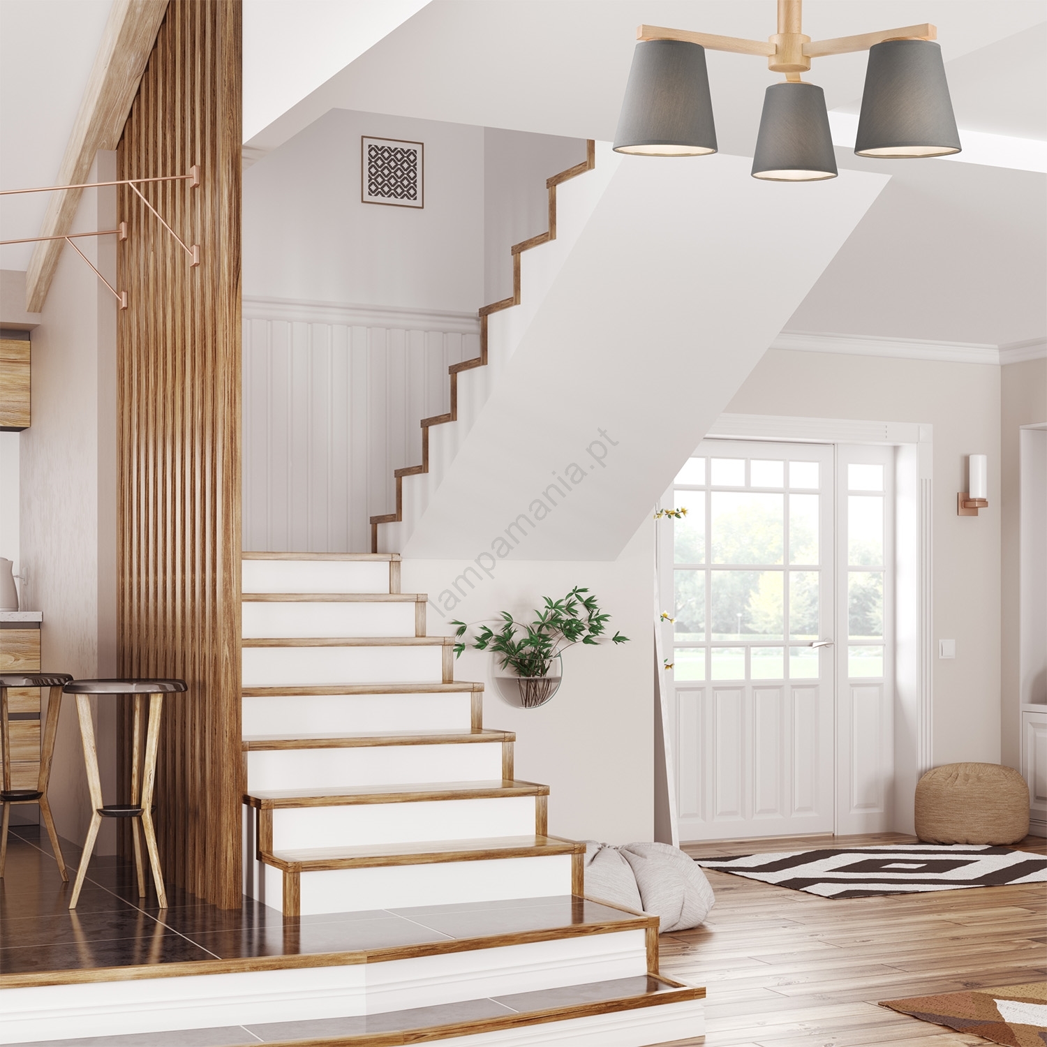 Lustre de teto ELLIE 3xE27/60W/230V cinza/bétula caracteriza-se por um design agradável e funcional.  Uma lâmpada com casquilho E27 é adequada para a iluminação Aqui, pode comprar outras lâmpadas a preços vantajosos. Terá um complemento interessante para a sua casa.