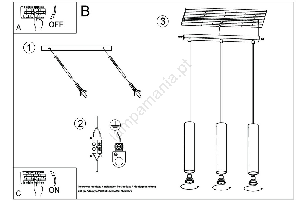 Candeeiro suspenso LAGOS 3 3xGU10/10W/230V branco caracteriza-se por um design agradável e funcional.  Uma lâmpada com casquilho GU10 é adequada para a iluminação Aqui, pode comprar outras lâmpadas a preços vantajosos. Terá um complemento interessante para a sua casa.