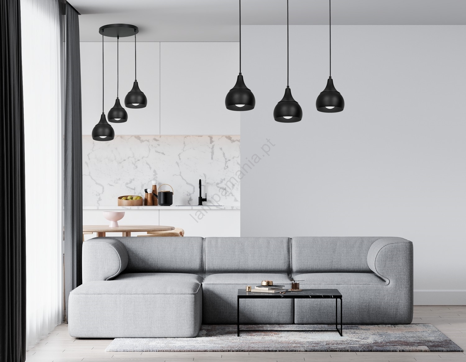 Candelabro suspenso AKTAN 3xE27/60W/230V preto caracteriza-se por um design agradável e funcional.  Uma lâmpada com casquilho E27 é adequada para a iluminação Aqui, pode comprar outras lâmpadas a preços vantajosos. Terá um complemento interessante para a sua casa.