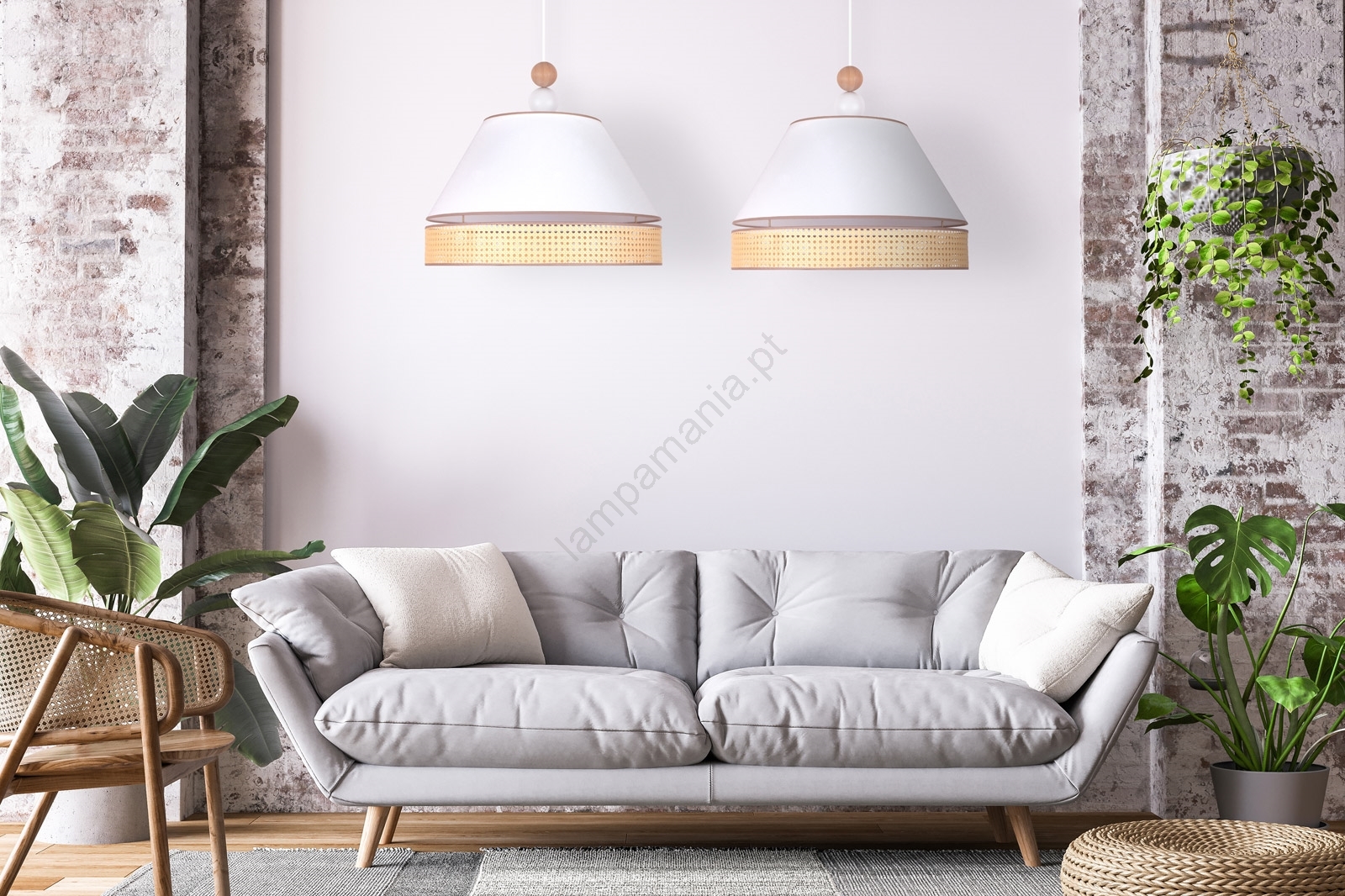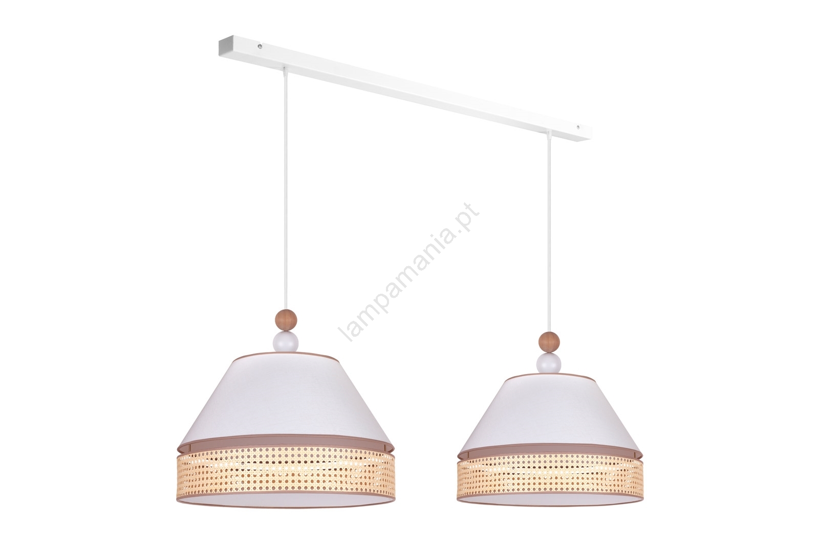 Duolla - Candelabro suspenso AVIGNON 2xE27/15W/230V branco/vime caracteriza-se por um design agradável e funcional.  Uma lâmpada com casquilho E27 é adequada para a iluminação Aqui, pode comprar outras lâmpadas a preços vantajosos. Terá um complemento interessante para a sua casa.