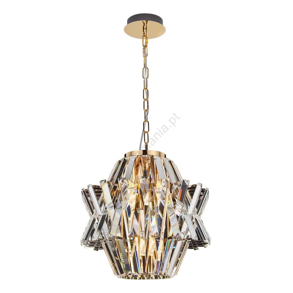 Candelabro suspenso de cristal CROWN 4xE14/40W/230V dourada caracteriza-se por um design agradável e funcional.  Uma lâmpada com casquilho E14 é adequada para a iluminação Aqui, pode comprar outras lâmpadas a preços vantajosos. Terá um complemento interessante para a sua casa.