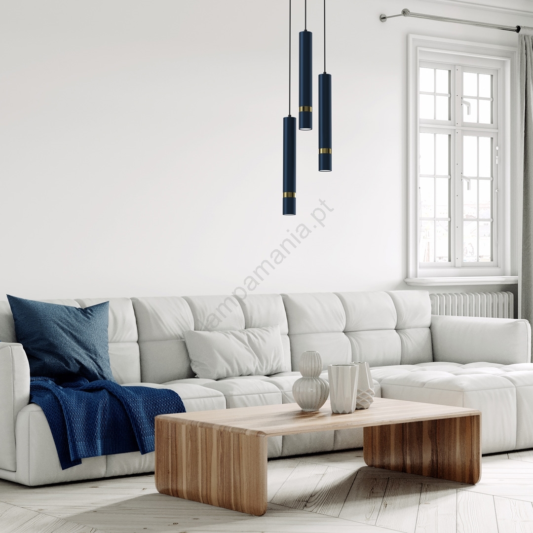 Candelabro suspenso JOKER 3xGU10/8W/230V azul/dourado caracteriza-se por um design agradável e funcional.  Uma lâmpada com casquilho GU10 é adequada para a iluminação Aqui, pode comprar outras lâmpadas a preços vantajosos. Terá um complemento interessante para a sua casa.