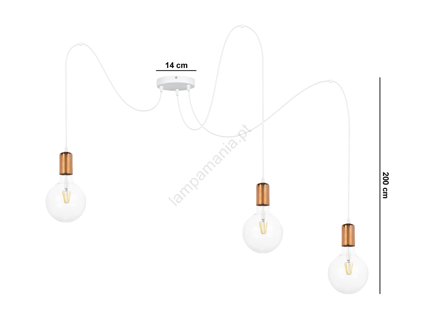 Candeeiro suspenso MIROS 3xE27/60W/230V aranha branco/cobre caracteriza-se por um design agradável e funcional.  Uma lâmpada com casquilho E27 é adequada para a iluminação Aqui, pode comprar outras lâmpadas a preços vantajosos. Terá um complemento interessante para a sua casa.