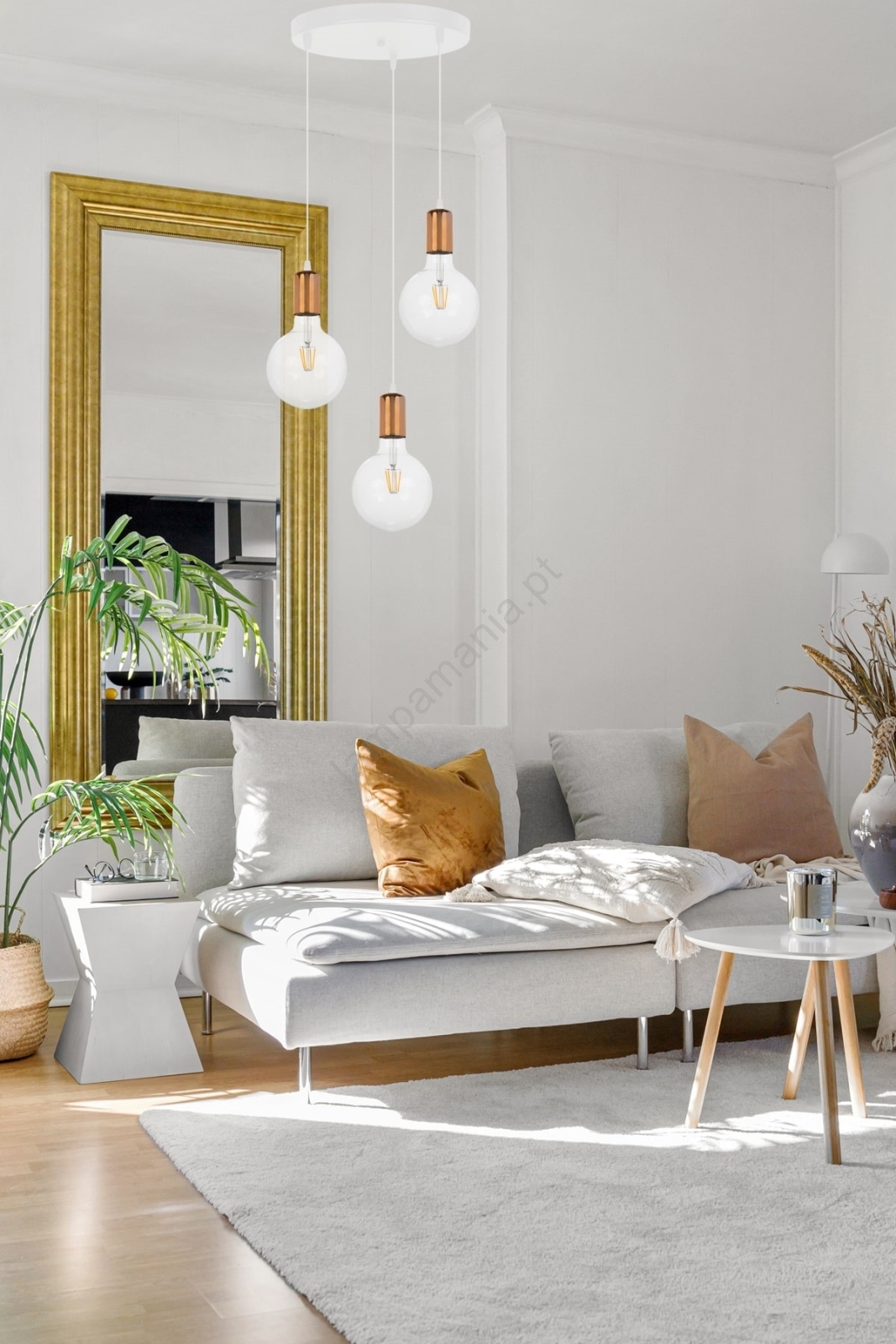 Candelabro suspenso MIROS 3xE27/60W/230V redondo branco/cobre caracteriza-se por um design agradável e funcional.  Uma lâmpada com casquilho E27 é adequada para a iluminação Aqui, pode comprar outras lâmpadas a preços vantajosos. Terá um complemento interessante para a sua casa.