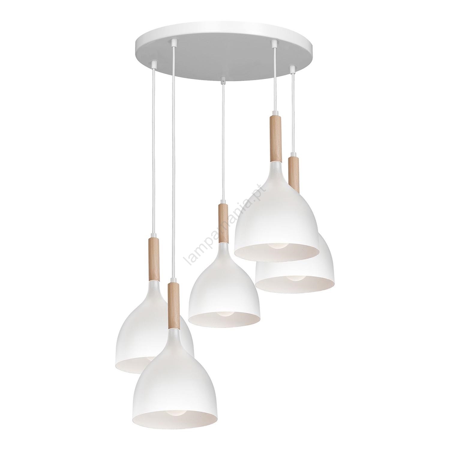 Candeeiro suspenso NOAK WOOD 5xE27/15W/230V branco/faia caracteriza-se por um design agradável e funcional.  Uma lâmpada com casquilho E27 é adequada para a iluminação Aqui, pode comprar outras lâmpadas a preços vantajosos. Terá um complemento interessante para a sua casa.