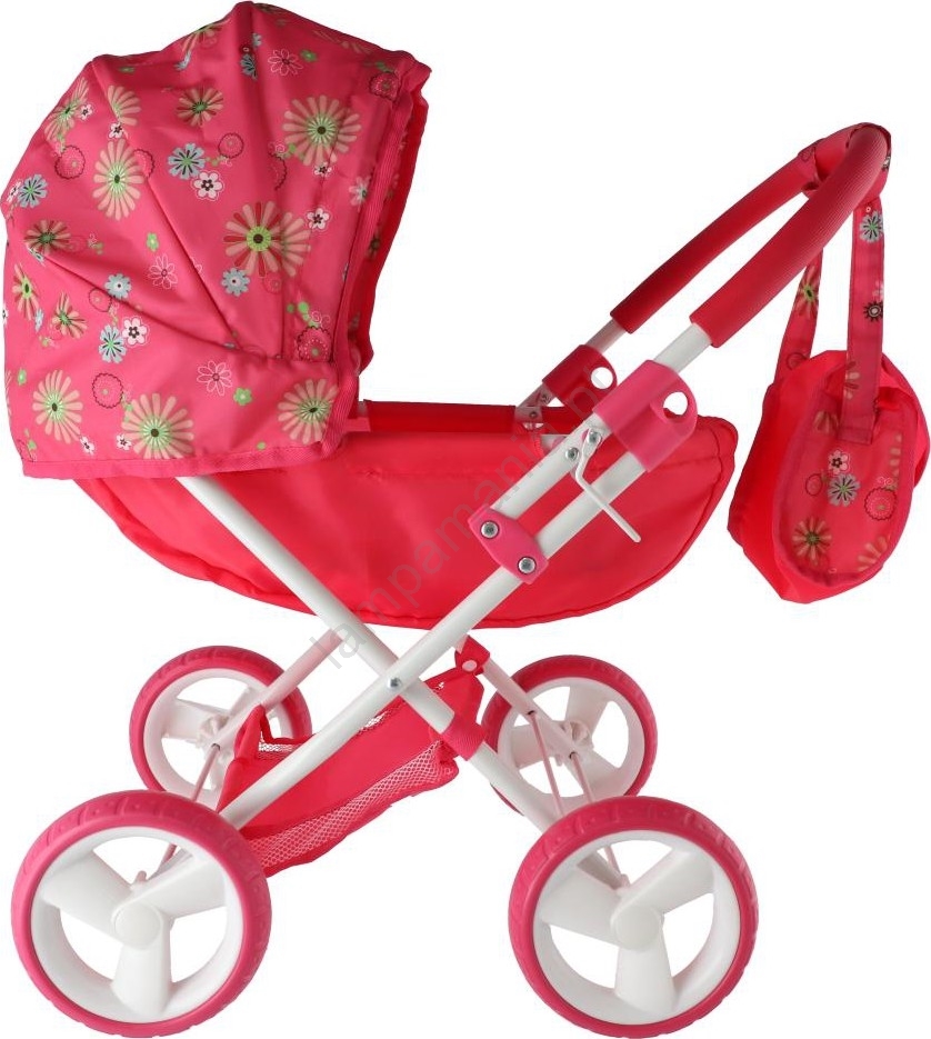 • Carrinho para bonecas com cesto de arrumação e capota prática.