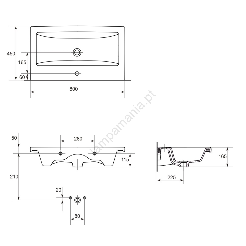 • A pia cerâmica apresenta um formato retangular clássico, com furo para torneira e transbordamento.