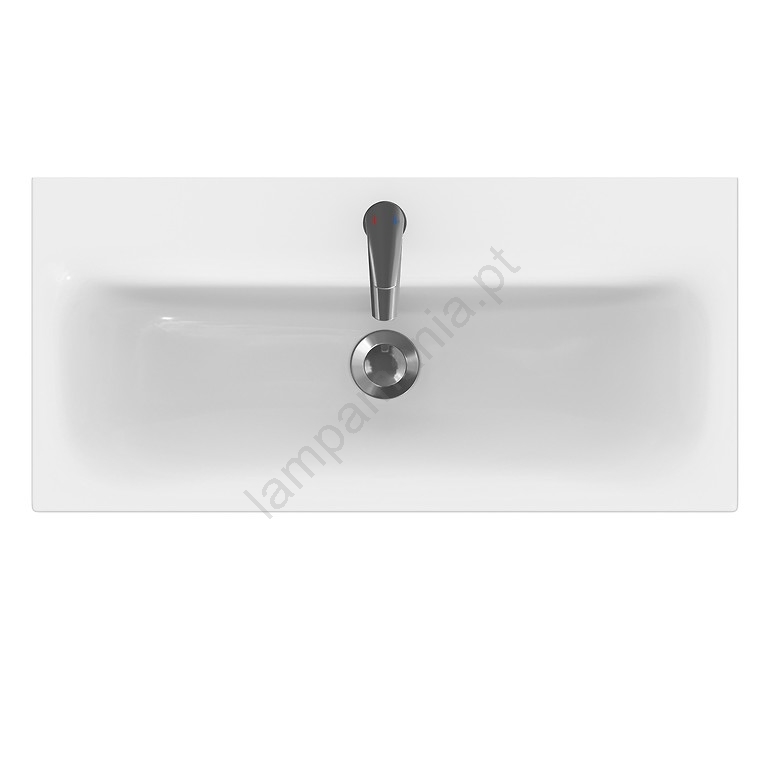 • A pia cerâmica apresenta um formato retangular clássico, com furo para torneira e transbordamento.