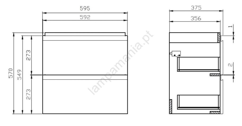 • O armário possui duas gavetas espaçosas com fechamento suave e puxadores embutidos.