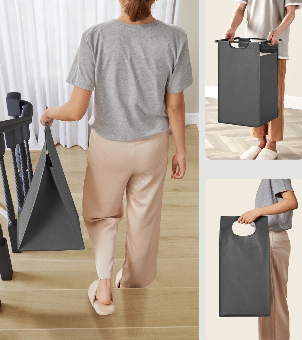 • 2 sacos, 2 prateleiras – Separe a roupa em dois sacos de tecido (46 l por saco) e coloque detergentes, amaciador e outros itens nas prateleiras acima.