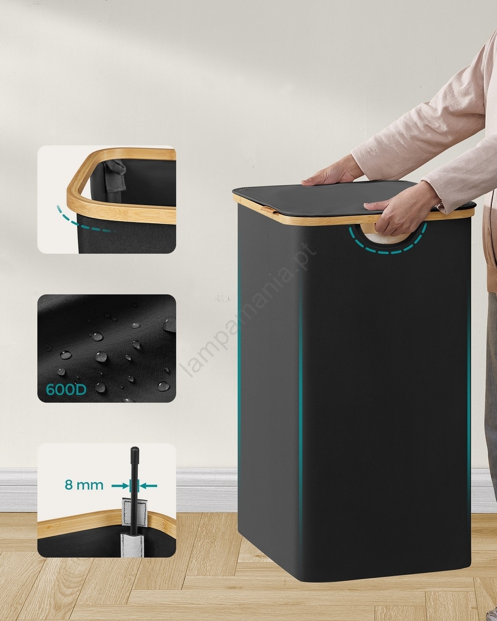 • A tampa pode ser aberta e fechada com uma mão, permitindo que cubra a roupa com facilidade - a tampa evita a propagação de odores e protege a roupa do pó.