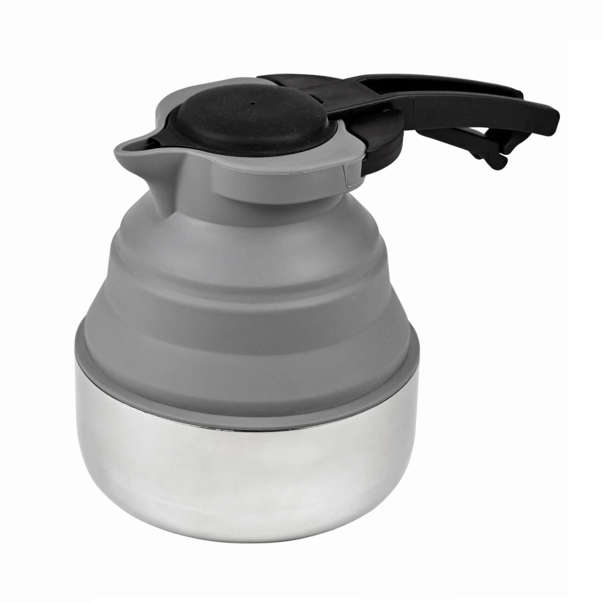• A chaleira dobrável com capacidade de 1,8 litros é uma solução prática para campismo, chalé, caravana, tenda ou cozinha pequena — dobra-se facilmente, poupando espaço.