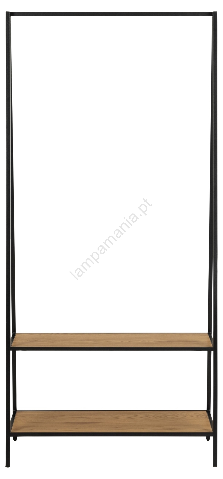 • Estrutura em aço preto fosco com pintura em pó texturizada, 2 prateleiras e base em craft fosco texturizado com barra para roupas.