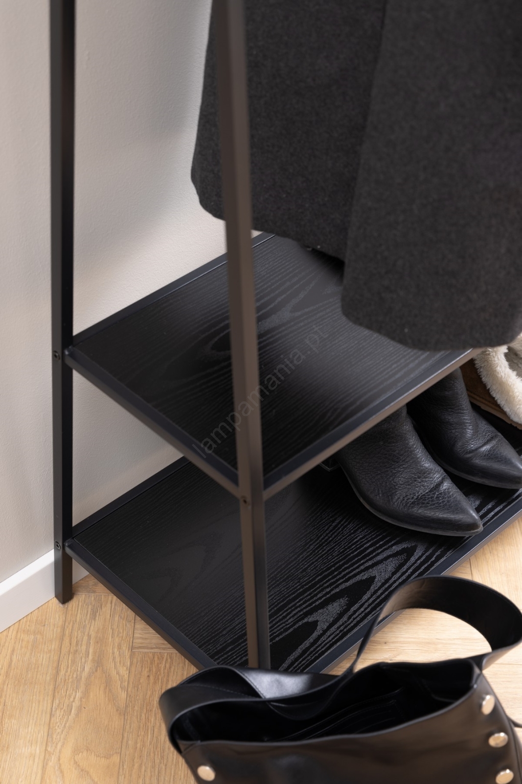 • Estrutura em aço pintado a pó preto fosco e texturizado, 2 prateleiras e base em melamina preta texturizada com barra para roupas.