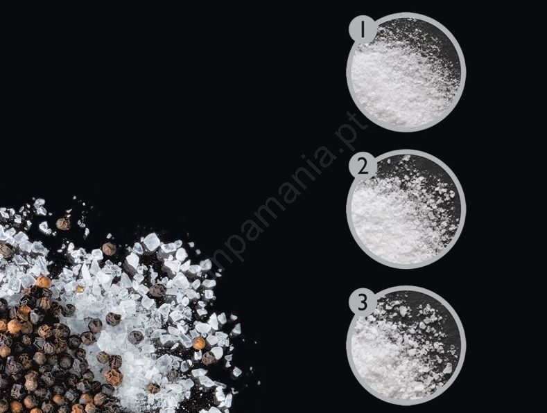 • Para obter moagem fina a grossa, basta girar o anel para uma das seis (pimenta) ou três (sal) configurações pré-definidas de granulação.